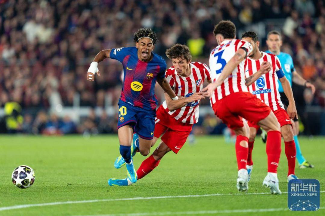 巴塞罗那队球员亚马尔(左一)和马德里竞技队球员勒诺尔芒(左二)在比赛中拼抢。(图源新华社)